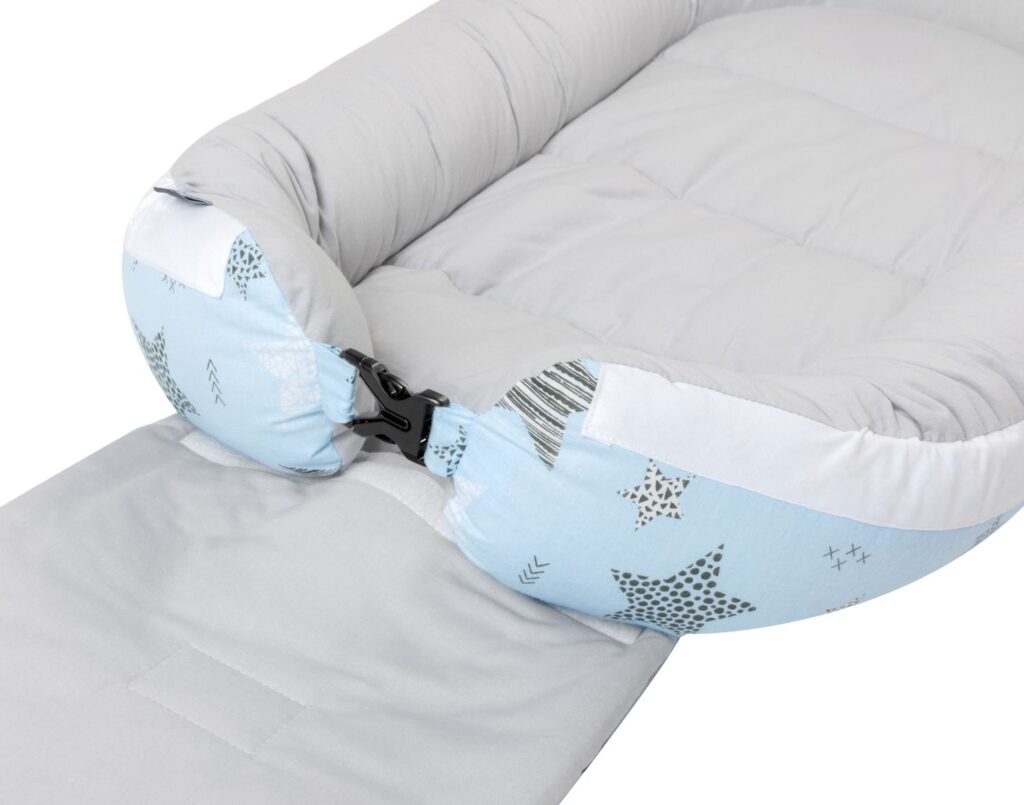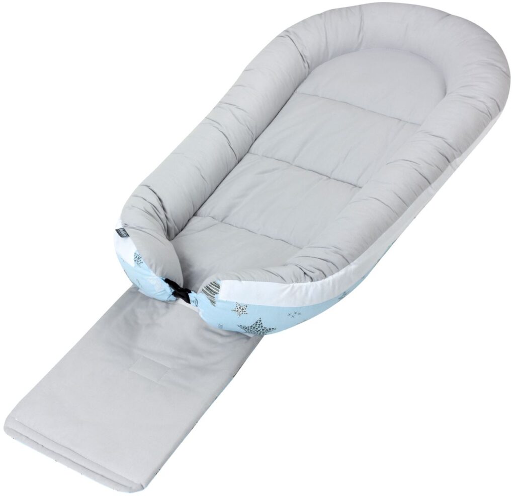 Le cocon pour bébé Rigel Star, extraordinairement élégant, avec des étoiles du ciel épanouies dans le bleu charmant, est fabriqué à partir de 100% de coton certifié, sans danger pour la peau sensible de bébé.