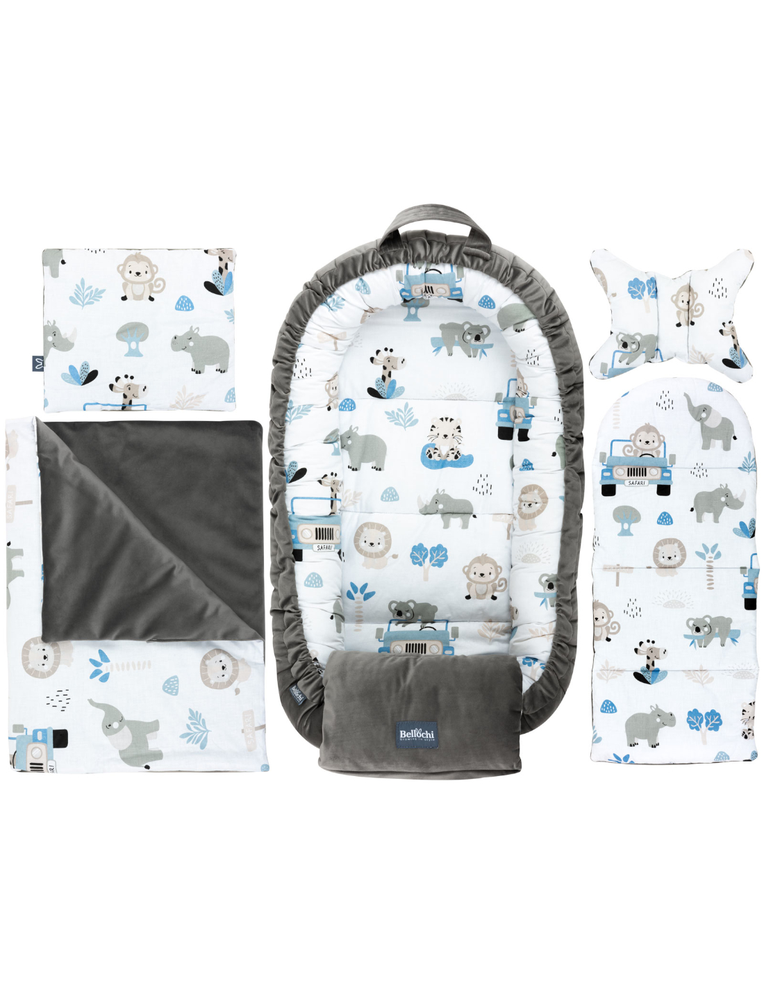 Le charmant ensemble de layette Safari est 100% fait à la main avec des matériaux certifiés, sans danger pour la peau délicate du bébé. Une combinaison extraordinaire de couleurs, blanc, gris et bleu, crée une collection magnifique et extrêmement enfantine. L’élégant ensemble pour bébé Safari sera utile dans de nombreux endroits et situations.