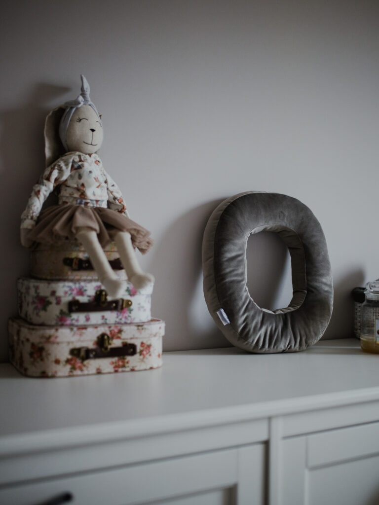 Oreiller décoratif en velours en forme de lettre O gris foncé